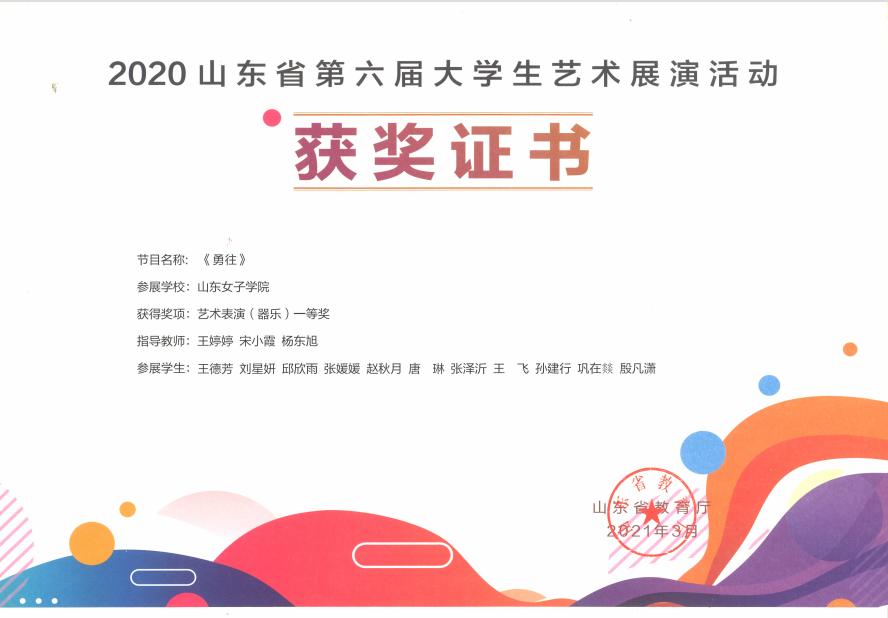 2023年由大学生艺术团选送的《“四促并举”高校高水平艺术团建设创新模式研究与实践——以山东女子学院大学生艺术团为例》荣获山东省高校美育改革创新优秀案例一等奖,这是学校首次获此殊荣,该项目被推荐到教育部参加美育案例评选。