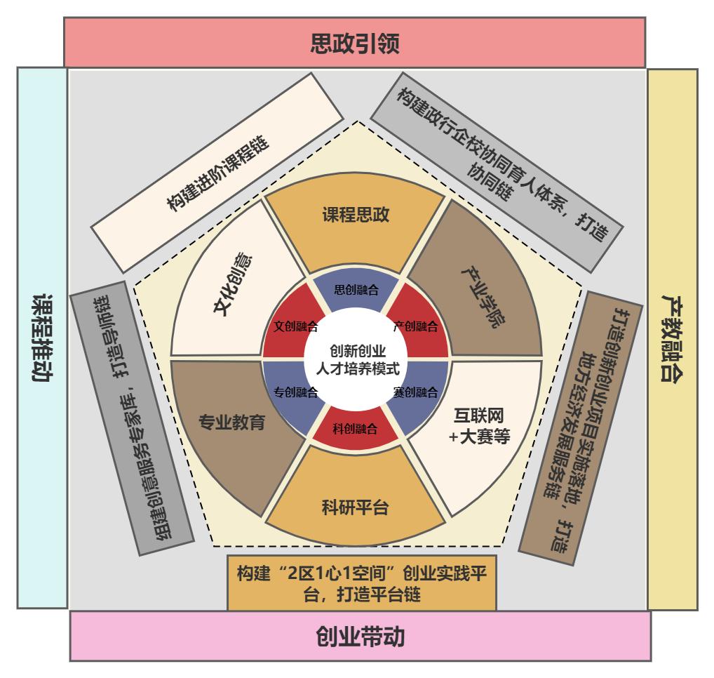 积极开展创新创业教育改革,全面提升创新创业教育质量,凝练“四轮驱动、五链协同,六创融合”创新创业人才培养模式。学院坚持以学生为中心的育人理念,确立了“思政引领,课程推动,就业带动,产教融合”四轮驱动的创新创业教学改革思路,组建“高校专家+企业导师”混编的创业导师链,构建“通识必修课+通识选修课+专业课程+创新创业训练营”四位一体专创融合进阶课程链,打造“2心1区1空间”创新创业项目孵化实践平台链、构建政行企校协同育人协同链,助力创新创业项目实践落地,服务地方经济发展的服务链。通过五链协同,促进具有具有女院特色的“思创、文创、科创、赛创,专创、产创”六创融合。