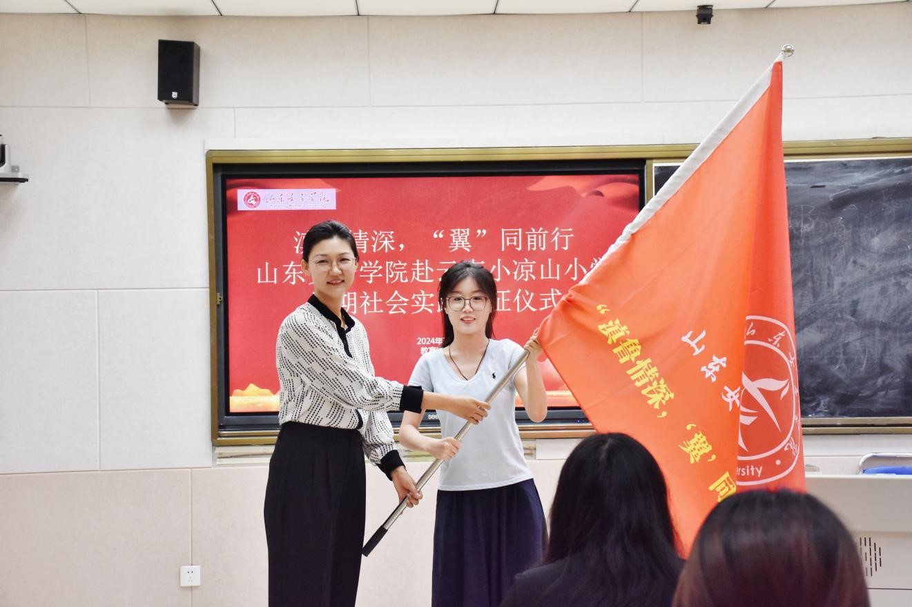 随后,苏婧向社会实践团队队长魏雨欣同学授旗,魏雨欣郑重地接过了象征团队使命与荣誉的旗帜,此次社会实践活动的正式启动,也象征着团队成员们将同心协力,共同面对挑战,迎接光荣使命。